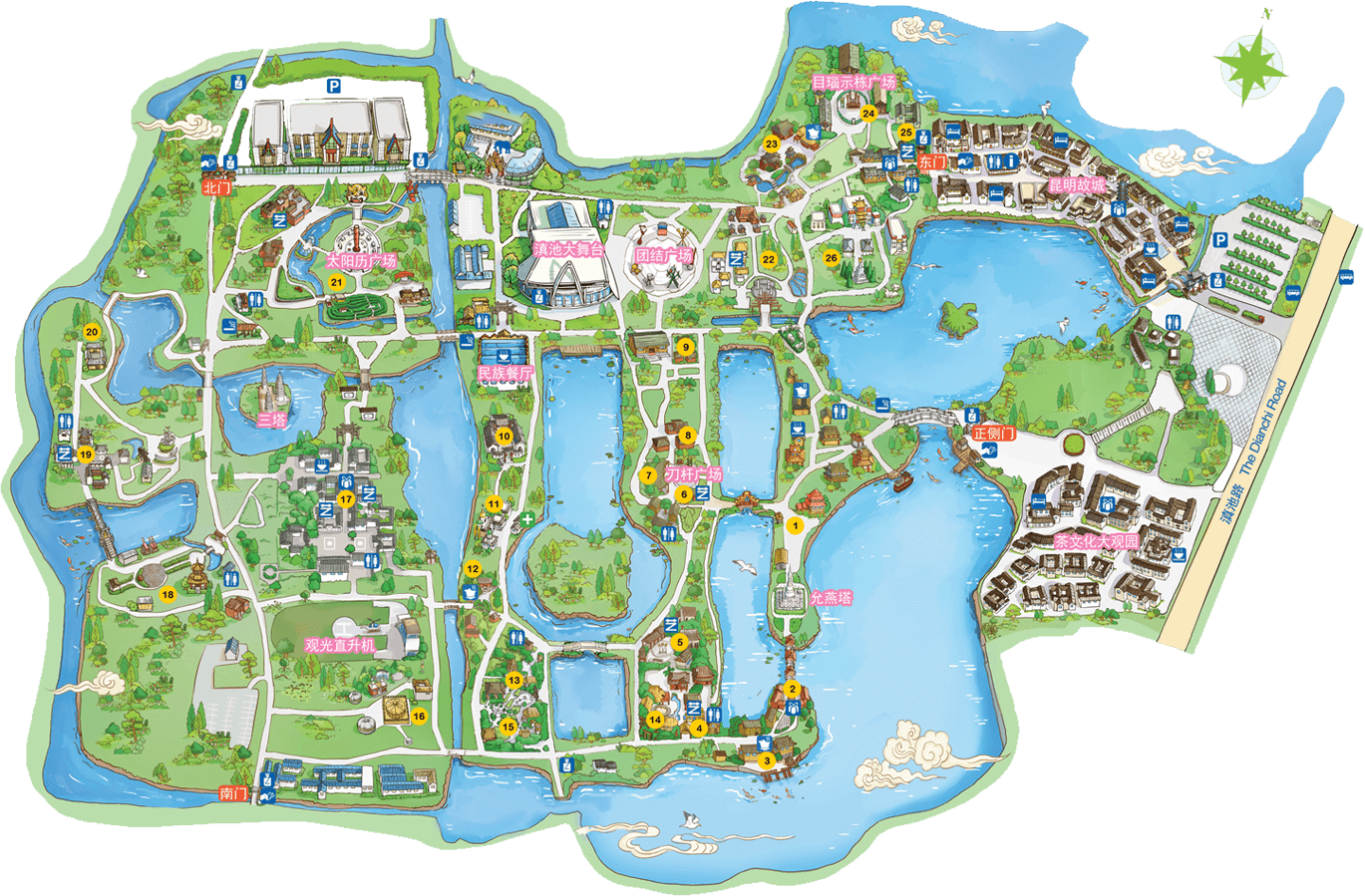佤族人口約36萬,主要聚居在云南省瀾滄江南段以西的阿佤山區(qū)。佤族寨位于“翠漪洲”東南角。寨內(nèi)分布有茅草頂?shù)母蓹谑浇ㄖ?、牛頭廣場、神靈廣場、司崗里石雕以及糧倉等。牛頭廣場是佤族古老的剽?;顒訄鏊?,場正中的牛角為佤族的寨樁,廣場前的兩個石人分別為佤族的男性和女性祖先。神靈廣場表現(xiàn)了佤族萬物有靈、靈魂不死的自然崇拜觀念。場中兩個石人雕像分別為佤族最崇拜的“木依吉”和“阿依娥”。佤族木鼓舞節(jié)拍鮮明強烈,...